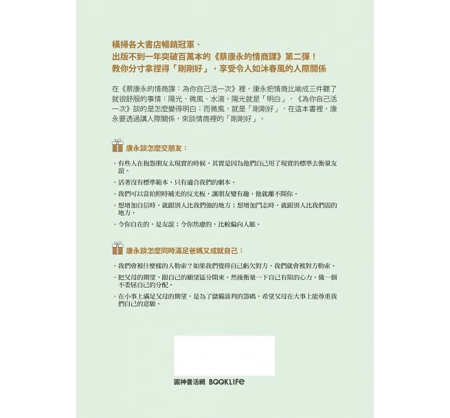 在《蔡康永的情商課:為你自己活一次》裡,康永把情商比喻成三件聽了就很舒服的事情:陽光、微風、水滴。陽光就是「明白」,《為你自己活一次》談的是怎麼變得明白;而微風,就是「剛剛好」,在這本書裡,康永要透過講人際關係,來談情商裡的「剛剛好」。